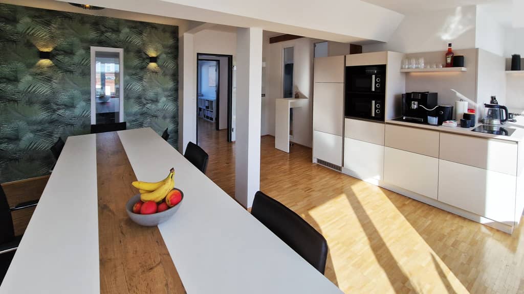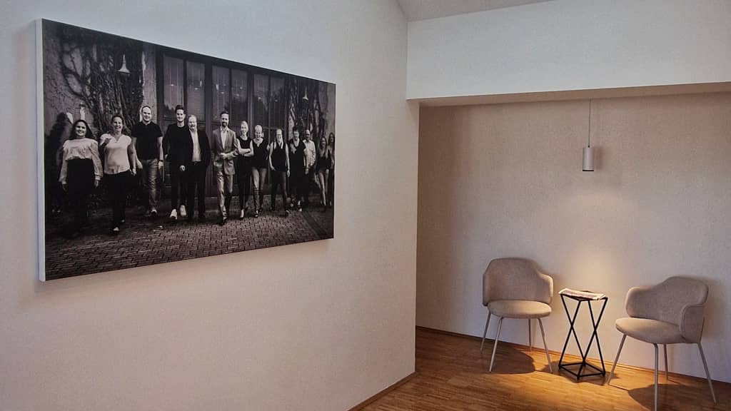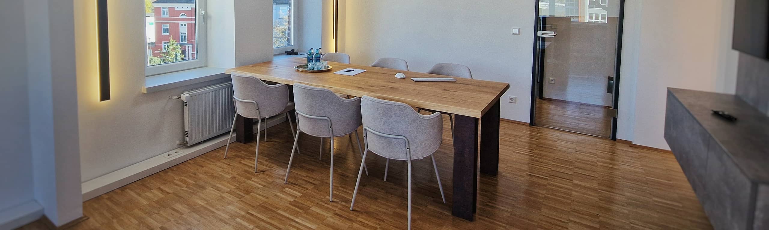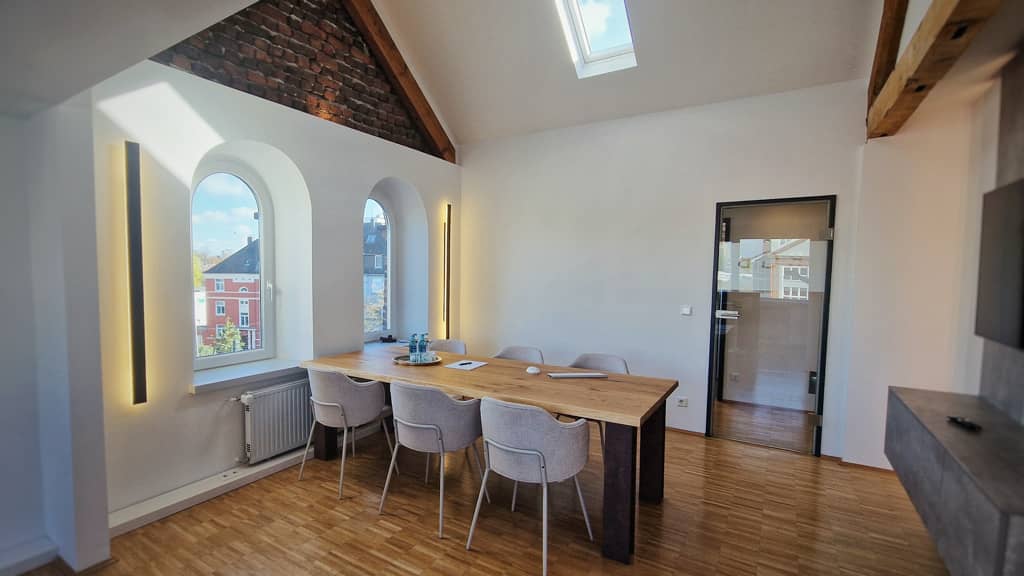 Im Rahmen des Kanzleiumzuges in ein altes Zechengebäude wünschte sich unser Kunde ein neues, frisches Design für seine Empfangs- und Besprechungsräume, das den historischen Charme des Zechengebäudes respektiert.