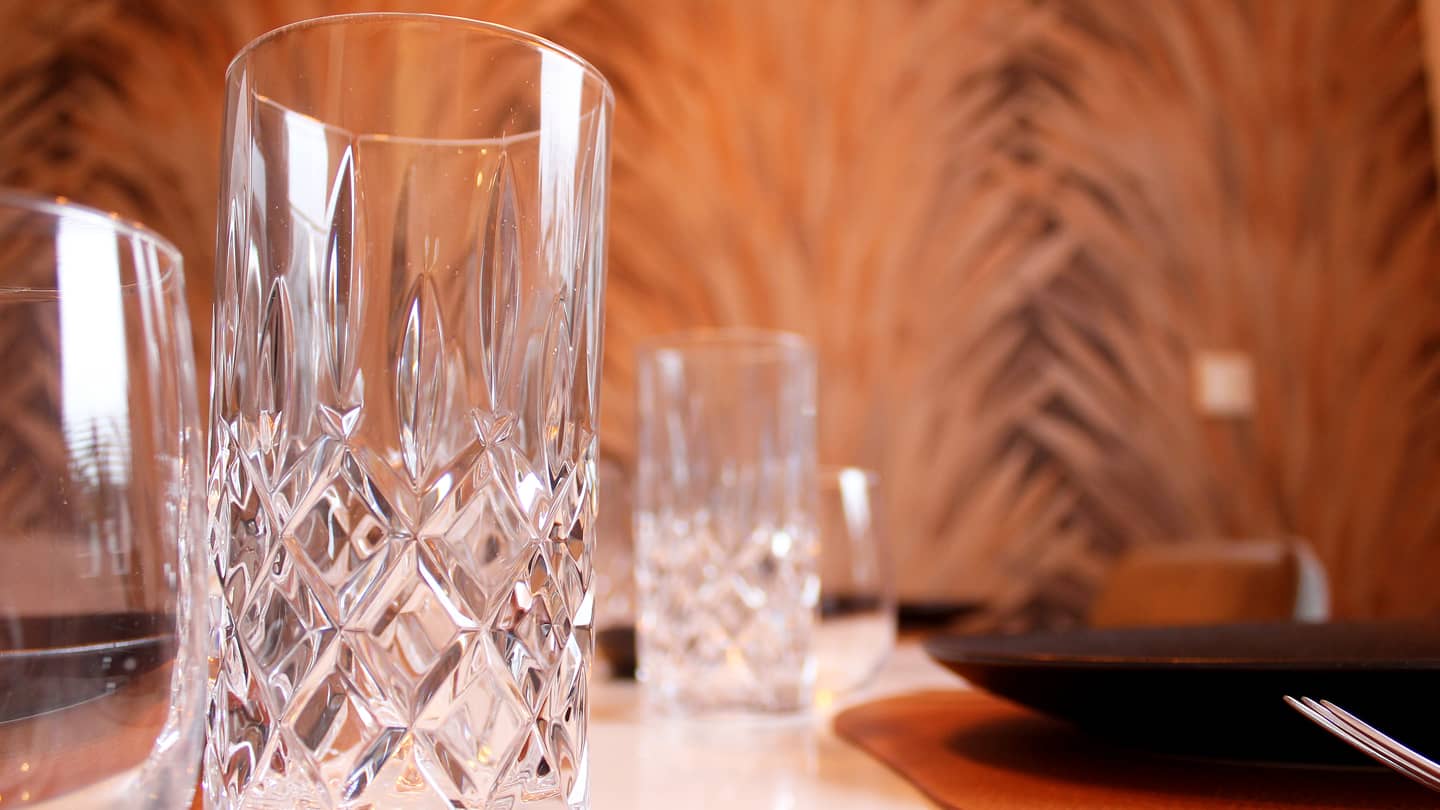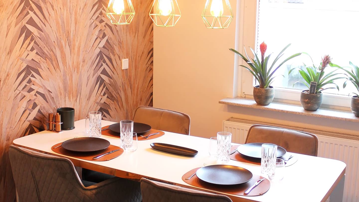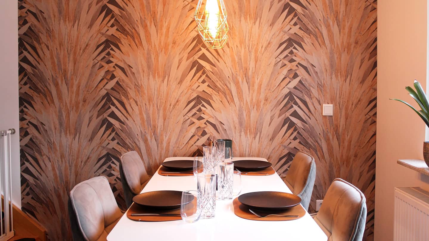 Für den Essbereich wurde das Element Kupfer als zentrales Thema gewählt. Das daraus abgeleitete Farbkonzept wird durch eine stilvolle Tapete auf die Wand übertragen und findet sich sowohl akzentuiert beim großzügigen Esstisch und der Beleuchtung wieder. In der offenen Küche wird das Thema Kupfer bei den Griffen aufgenommen und durch die komplementäre Arbeitsplattenfarbe unterstrichen.